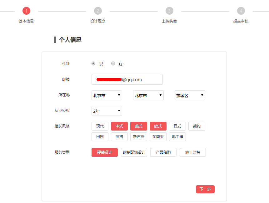 1.3). 填寫個人信息后點擊下一步。(注:基本信息擅長風格選擇不要超過3個。)