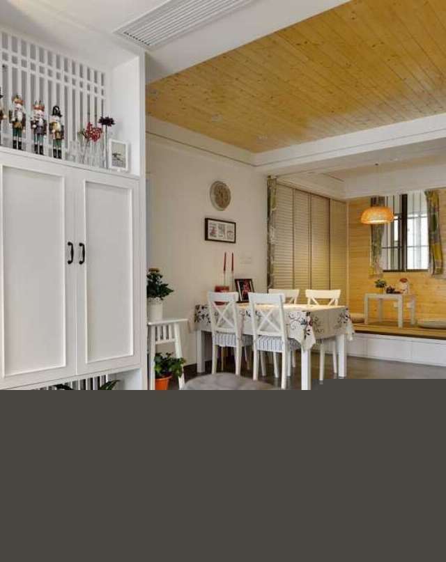 為了弱化墻面的單調(diào)感,設(shè)置了木板墻。讓墻面的材質(zhì)和頂部的材質(zhì)有一定的互動。