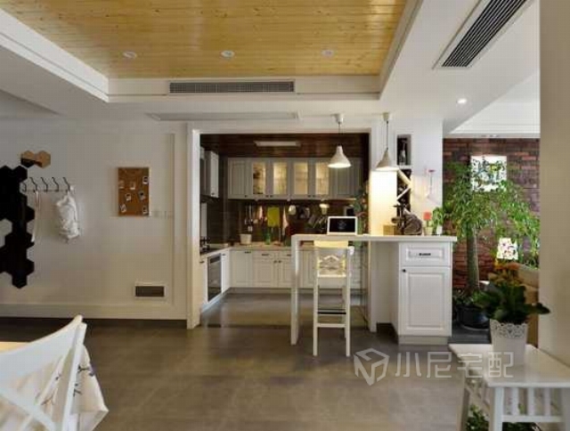 開放式廚房搭配吧臺,讓原本局促的廚房空間和餐廳區(qū)域合二為一,增加了空間的互動性。