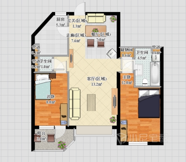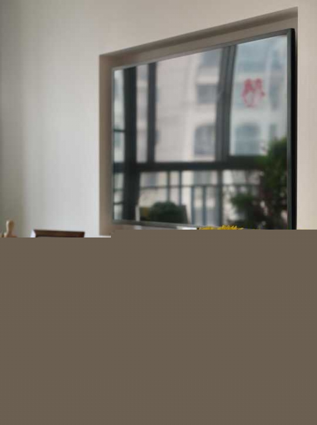 電視背景的儲物柜,滿足裝飾的功能,同時上下的半通透的處理,可以增加過道區(qū)域的變化。地面采用半啞光的地磚,具有防滑的效果。