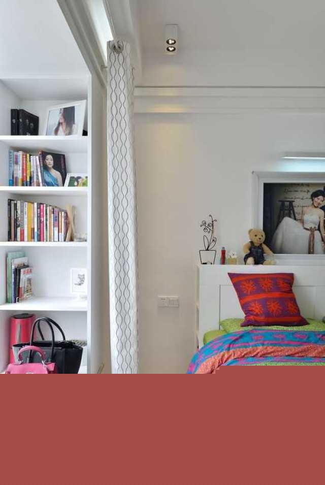 利用飄窗臺設(shè)置書柜,增加儲物的同時,也讓物品的收納更加集中美觀