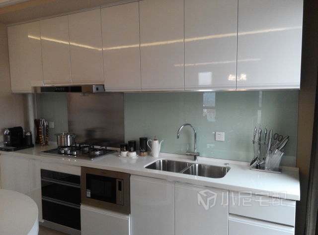 廚房一角,烤漆整體廚房,背漆玻璃加不銹鋼板的中空設(shè)計(jì)體現(xiàn)出年輕人的時(shí)尚