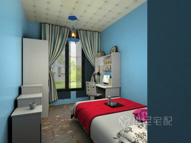 次臥,純白的歐式臥室家具搭配淺藍(lán)壁紙,色彩明快。