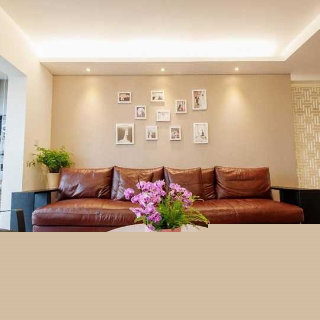 沙發(fā)背景墻作為了展示小夫妻婚紗照的照片墻。深色的皮沙發(fā)增加了整個(gè)空間色調(diào)的重量。