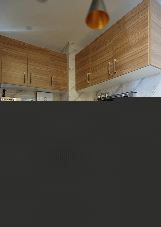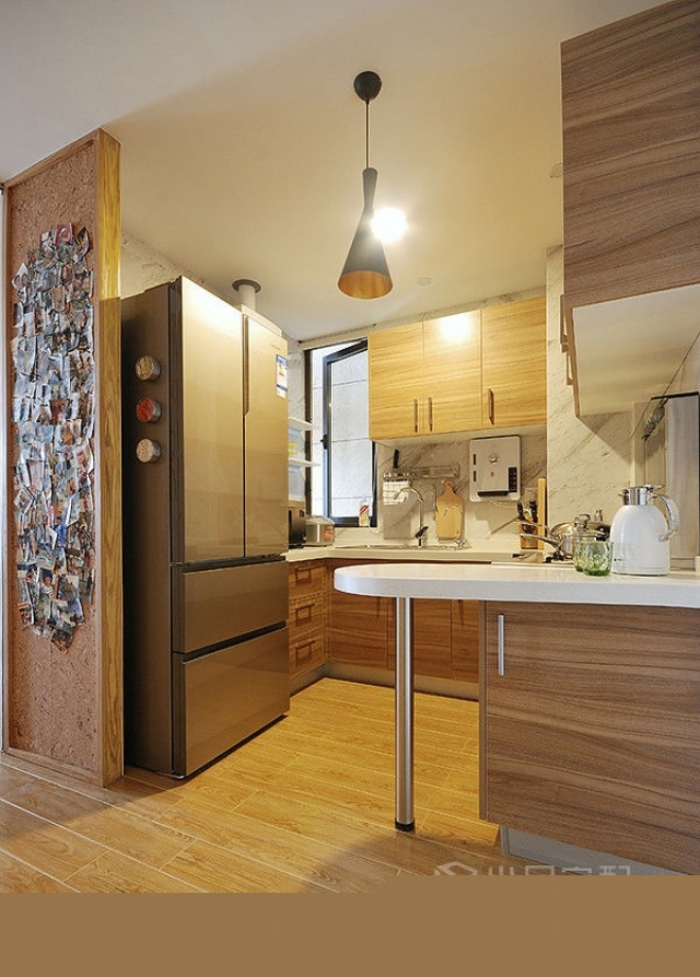 開(kāi)放式小廚房,原木紋理在昏黃的燈光的照射下,覺(jué)得暖暖的。
