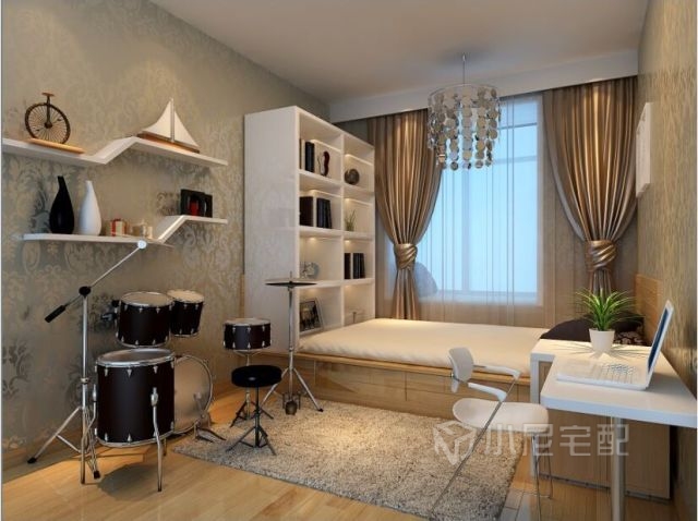 冷靜的書房,榻榻米,書桌一體,還有主人最愛的架子鼓,充分利用了空間。