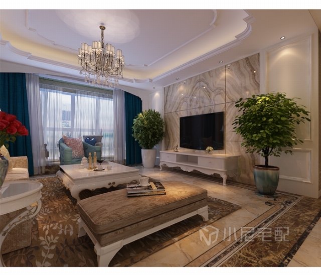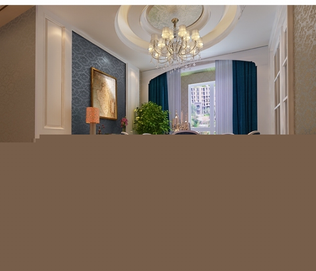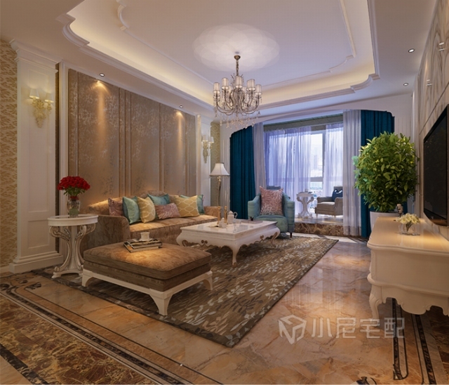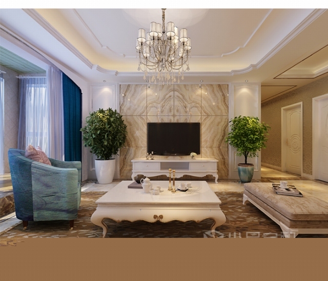 客廳藍色窗簾和水晶燈的搭配讓整體色調(diào)清爽一些。