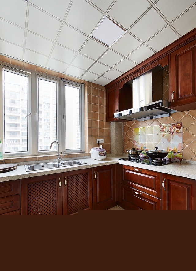 廚房中規(guī)中矩,沒(méi)有浪費(fèi)的空間,L形不會(huì)因?yàn)槎嘤嗟脑O(shè)計(jì)而顯得擁擠。