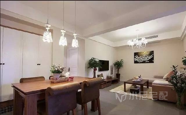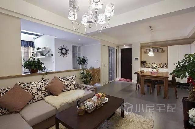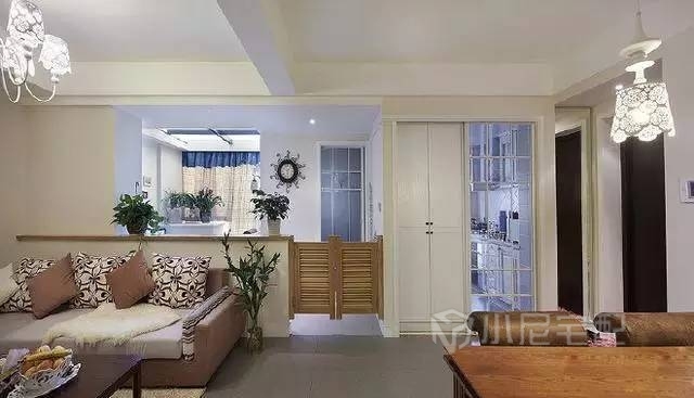 純粹的白色墻面單調(diào)乏味,設(shè)計師精心挑選了一扇腰門,讓進(jìn)出書房多了一份田園趣味。 客廳與餐廳的家具簡單而質(zhì)樸,在綠色植物的陪襯下,顯得簡約、大氣,恰有一份古樸韻味。