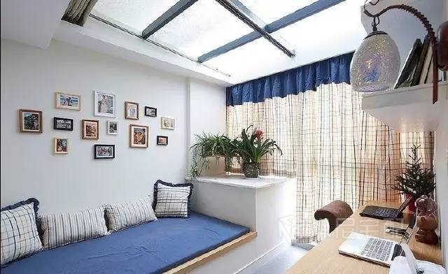 這個陽光書房由大陽臺改造而來,搭建玻璃天窗,增強(qiáng)采光,藍(lán)白色調(diào)營造出地中海式的自然浪漫。