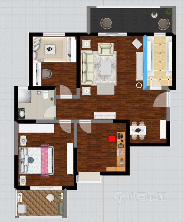 陽臺設(shè)計與客廳相互照應(yīng),綠色盆栽增添生機。