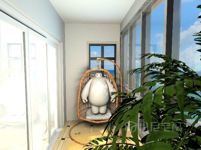 陽臺上有一個吊床,上面還放著業(yè)主最喜歡的大白。