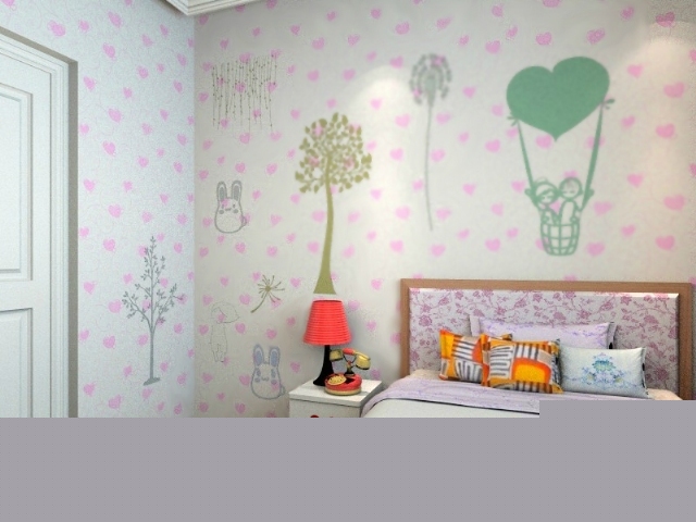 粉色心形墻紙給人一種清新可愛(ài)的效果,墻上的印畫(huà)將兒童房的浪漫氣氛烘托的淋漓盡致。