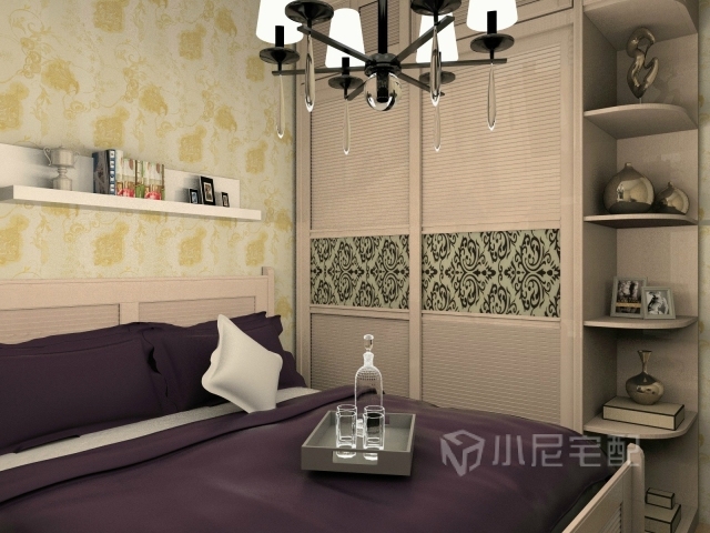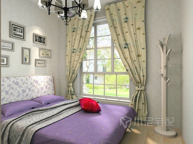 整個(gè)臥室比較溫馨,紫色床和窗簾彰顯出一種清新淡雅的氣氛,更有家的感覺(jué)。