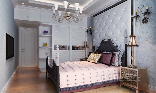 簡約的造型處理臥室門與電視墻的關(guān)系,玻璃鏡面增加空間感與時尚感。木門為天安木門德佳系列。