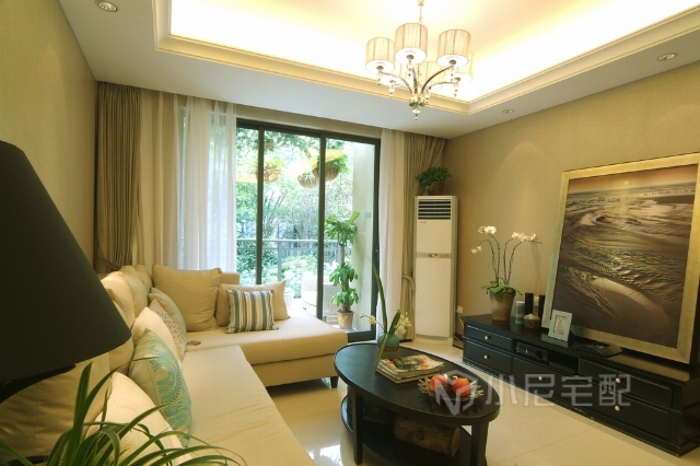 客廳不需要任何裝飾,茶幾、電視柜、壁畫,如同畫室一般。