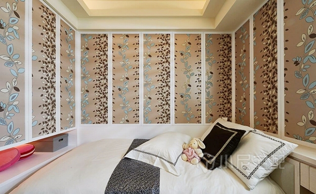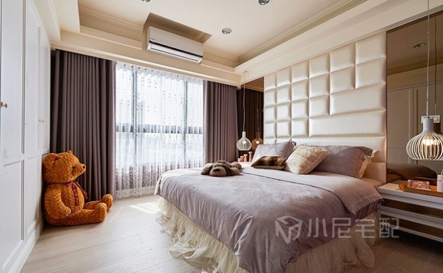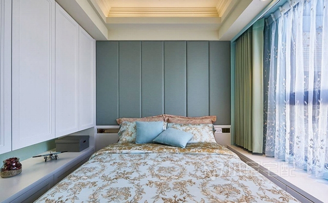窗邊柱體納入床頭繃布規(guī)劃,并結合臥榻柜體使用。