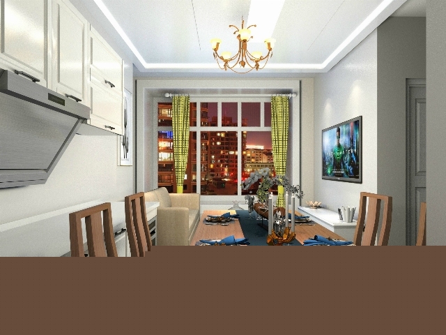 整個(gè)空間的布局,集客廳、餐廳、廚房一體化,合理利用空間。
