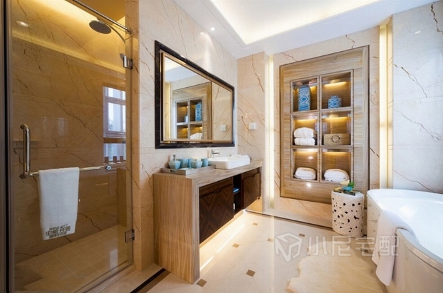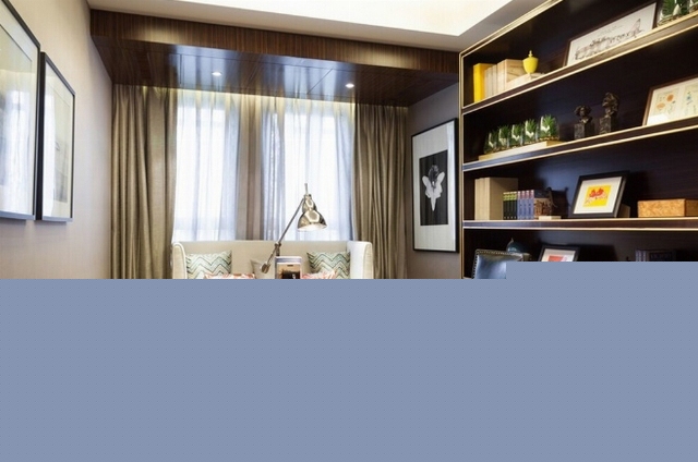 在配飾陳設上,設計師充分運用縝密而細膩的木,加上棉麻、絨布、皮質等各種材質的組合。整個空間不因家具的純正深色感到壓迫和沉重。銅制的藝術品、玻璃的擺件、陶瓷的瓶罐等,營造出深淺變化的剔透空間與生活品質。
