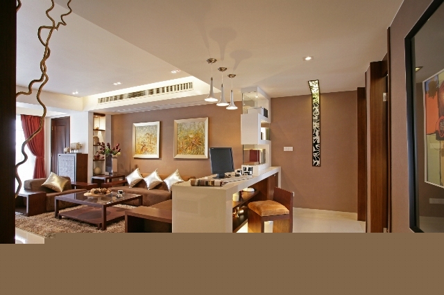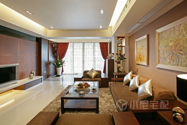 白色和米色的環(huán)境中,加了一些棕色來一起營造出溫馨的客廳。