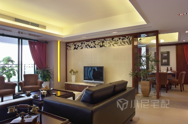 端莊大氣的客廳,以黑色和紅色為主。格調(diào)高雅,造型簡(jiǎn)樸優(yōu)美,色彩濃重而成熟。
