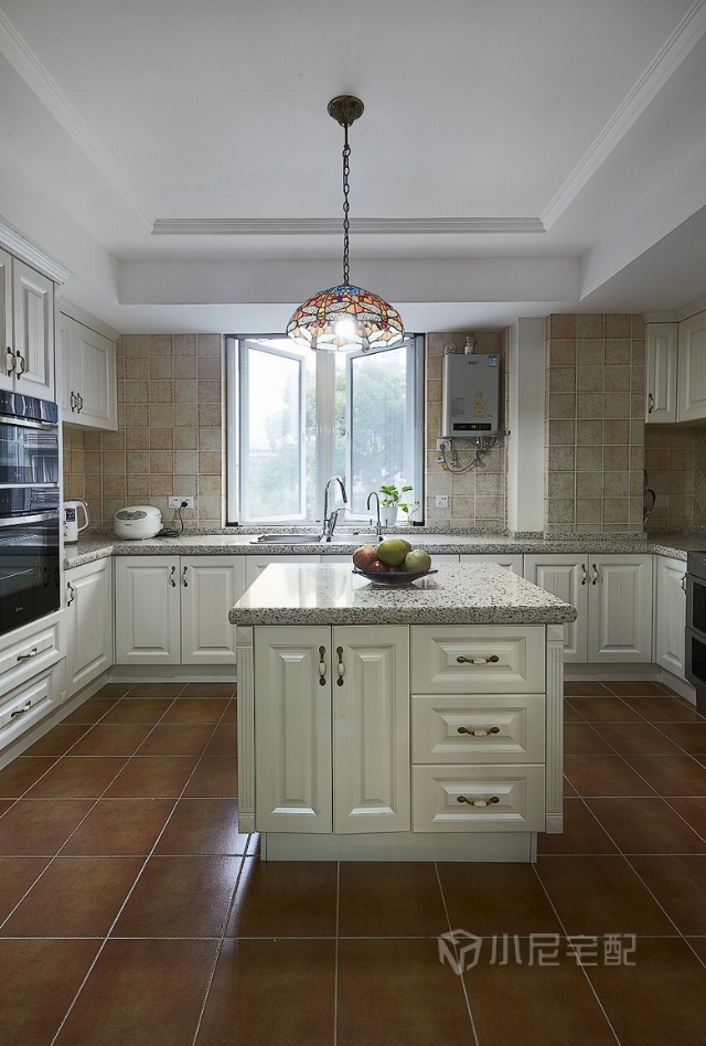 開放式的廚房,中間還有一個(gè)小倒臺(tái),足夠一家人一起做飯了,氣氛一定很不錯(cuò)吧。