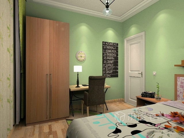 同樣小清新的窗簾與綠色墻紙呼應(yīng),外面還有一個(gè)獨(dú)立的陽臺(tái),戶型真的非常非常緊湊而實(shí)用。