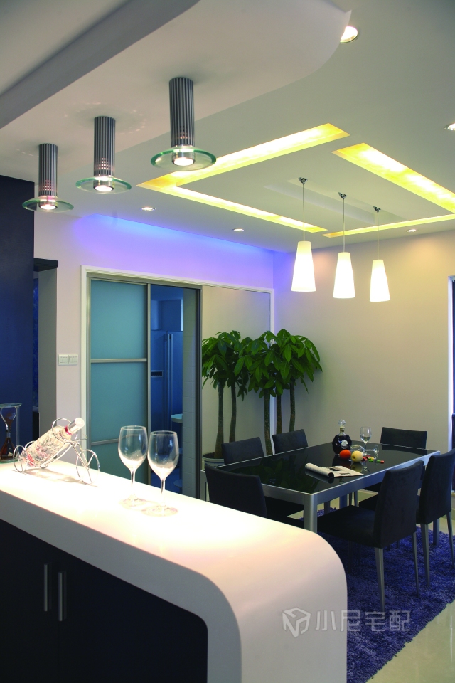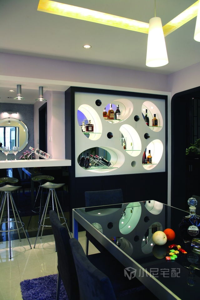 酒柜及沙發(fā)背景墻飾橢圓形蜂巢的奇特造型寓意專為新婚業(yè)主打造的甜蜜“愛巢”。而隱含在空間各部位的“L”造型元素是將男女主人姓氏拼音首位字母與他們的新居巧妙地結(jié)合在一起,全屋紫灰熏衣草色系綴以藝術(shù)玻璃、灰鏡等材質(zhì),營造出對比強(qiáng)烈的時尚氣息,彰顯出業(yè)主的不凡品味。家裝家具一體價:19萬。