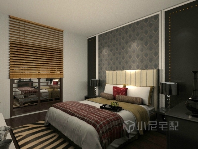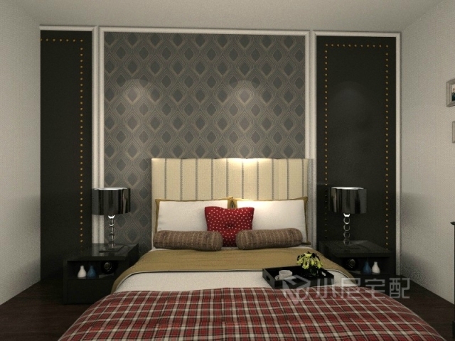 黑灰的的幕墻搭配淡色的床頭讓人視覺上很舒適,再加格子床單紅色枕頭的陪襯讓臥室并不單調(diào)。