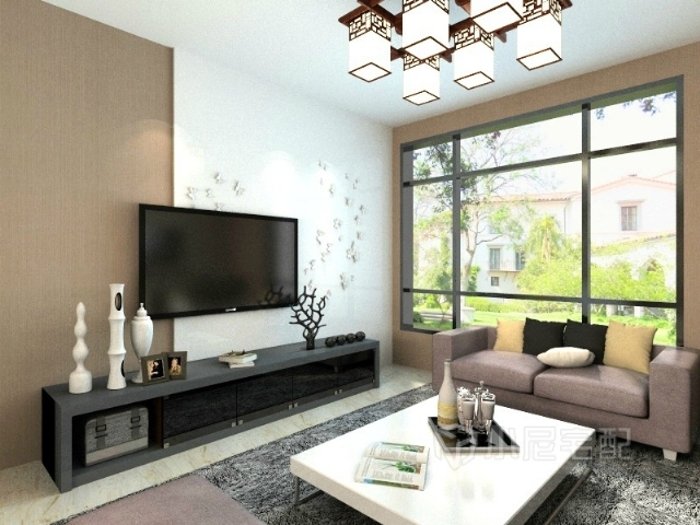 黑色電視柜白色的茶幾棕色白色的電視墻拋去繁雜的色彩,簡單卻不單調(diào)。