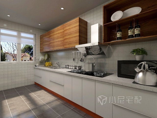 廚房既是儲存生活必備飲食設備的場所,也是為日常生活提供飲食保證的場所。白色和木色搭配的廚房儲物柜儲藏著整個廚房需要用的物品,讓整個廚房看起來那么的井井有條。