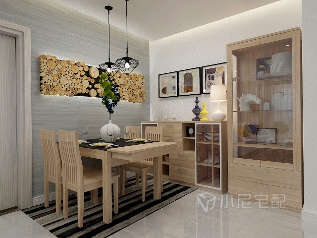 木質餐桌搭配上顯眼的綠色植物讓整個餐廳呈現(xiàn)出一種生機勃勃的自然美,墻邊的餐廳柜能更大的儲存收納。