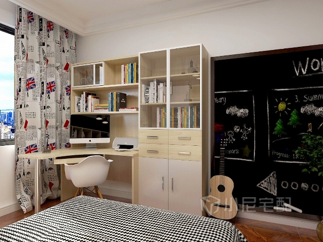 次臥室的書房和電腦桌簡約但不簡單,給人的感覺是簡單、大方、舒適、清爽的感覺,顏色的運用采用淡色系列為主,這樣簡約風格的環(huán)境,給人感覺非常的舒服。讓我們從簡約開始,開啟讀書時代。旁邊的吉他顯示出小主對音樂的喜愛。