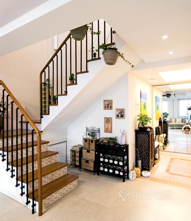 樓梯下的置物柜,滿足裝飾的功能,梯階木板和瓷磚的設(shè)計更增添藝術(shù)感。