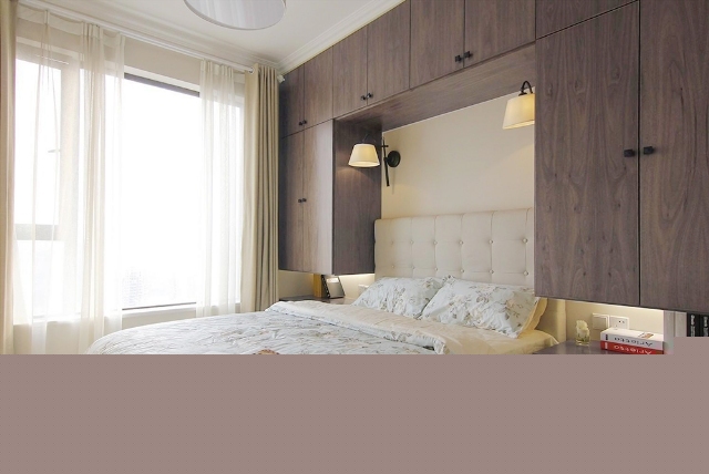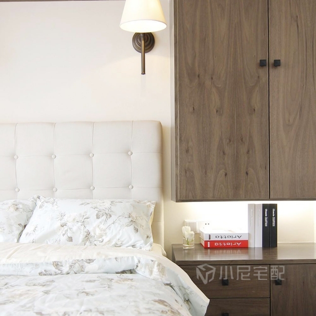 空間大小限制,將衣柜設(shè)置于床頭,床頭燈光滿足閱讀和夜燈功能。