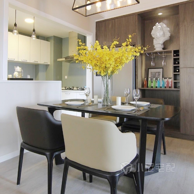 造型獨特的餐桌,搭配舒適又有質(zhì)感的餐椅,黃色花束讓空間頓時鮮亮起來。