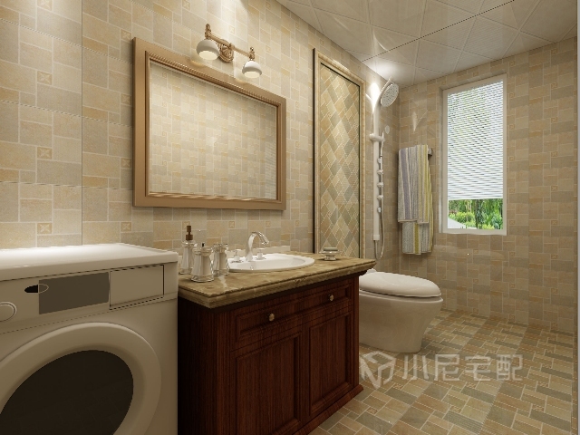 整體的瓷磚上下呼應(yīng),回型背景與邦度衛(wèi)浴的花邊鏡框深色橡木洗手臺,無一不體現(xiàn)著中式韻味。