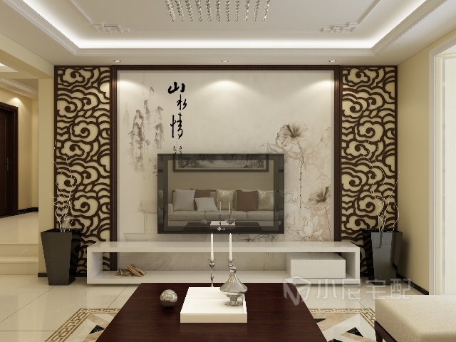 大幅的寫意字畫,配以經(jīng)典的深色木質(zhì)鏤空雕花,彰顯了主人豐厚的文化底蘊。與簡單的白漆電視柜和瓷質(zhì)花盆相結(jié)合,給人以強烈的視覺意志力,成為時尚與古典的柔媚結(jié)合。