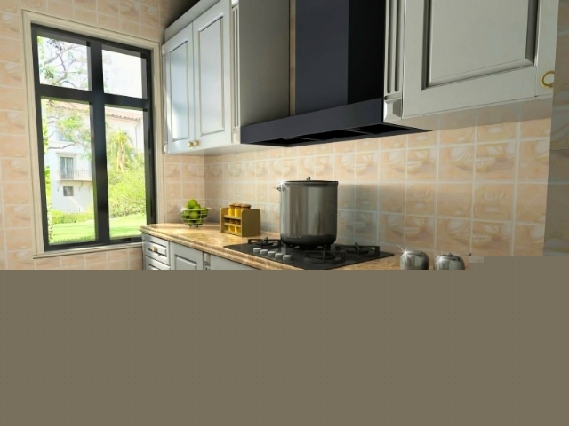 白色柜體搭配黃色石英石臺(tái)面,凸顯廚房的整潔