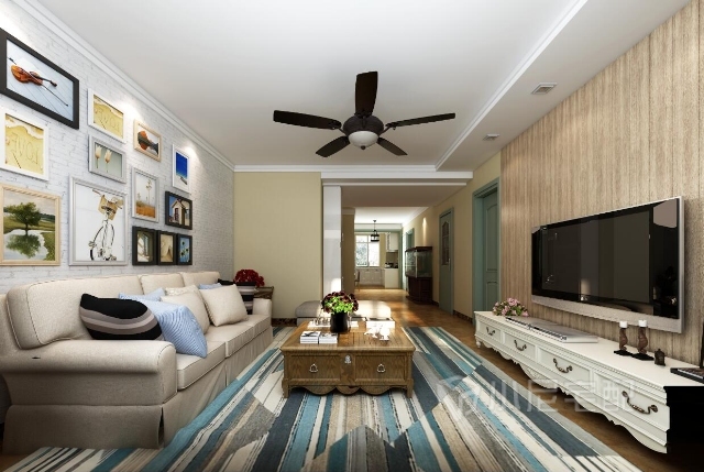 單側(cè)影視墻吊頂,簡答而大氣,沙發(fā)背景做成照片墻,一墻兩用。