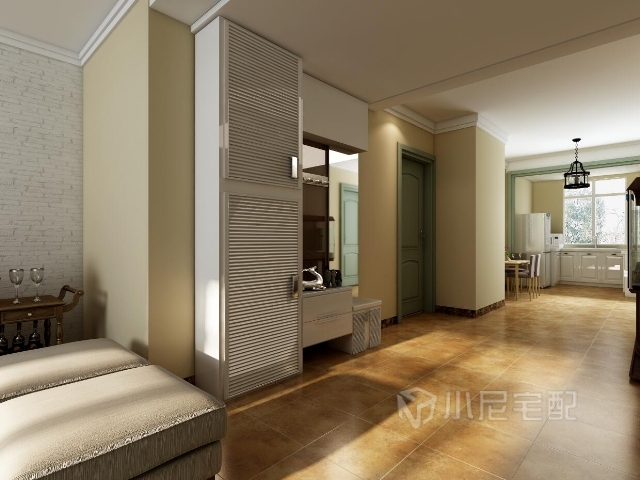 白的的仿古磚,木飾面影視墻,悠閑而典雅,搭配法國灰的木門,標準的田園風格。