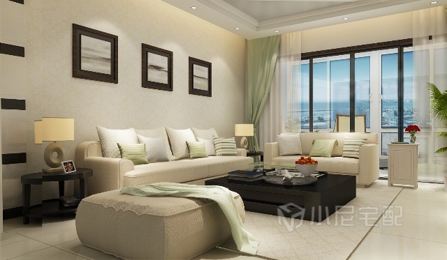 大大的落地窗給人一種通透感,寬敞明亮的客廳,室內(nèi)簡潔清新的裝飾,窗外風景如畫,愜意而美好。