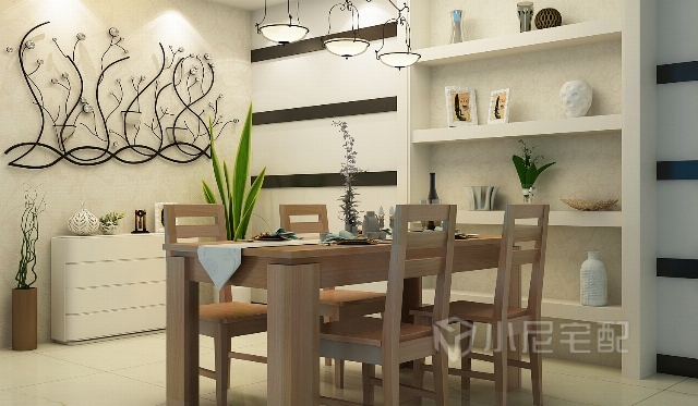 墻體柜的設(shè)計帶來了豐富的層次感,柜上陳設(shè)的裝飾品體現(xiàn)主人的藝術(shù)品味,整個餐廳簡潔大方又富有生活氣息。