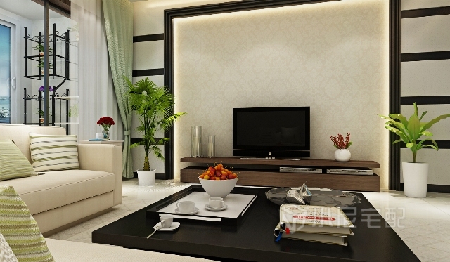 玄色的茶幾和電視背景墻搭配,簡潔中有充滿線條感,坐在舒適的沙發(fā)上,看看電視看看書。