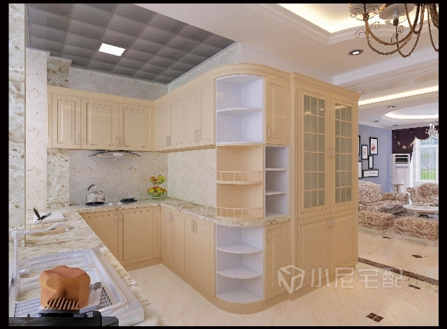 廚房整體定制,獨(dú)特的弧形擺臺(tái)設(shè)計(jì)結(jié)合酒柜設(shè)計(jì)讓使用空間大大提升