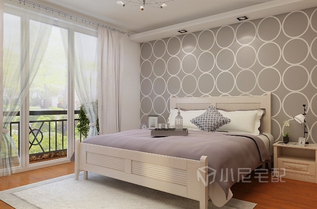 灰色圓圈的壁紙顯得輕松活潑,與床和床頭柜干凈利落的線型成對比,增加了空間的幾何感。