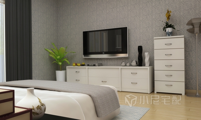 白色現(xiàn)代的電視柜與床相搭配,多層屜柜增加了臥室的儲(chǔ)物功能。