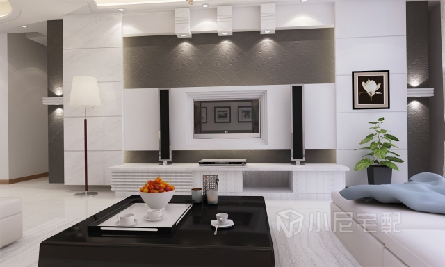 簡潔的電視背景墻,使單一的墻面富有立體感,利用射燈使空間富有層次和變化。