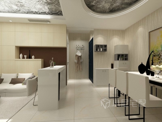 客廳的陳設(shè)增加了一個(gè)吧臺(tái),也起到一個(gè)分隔的作用,同時(shí)滿足現(xiàn)在年輕人的生活品味,沙發(fā)背景墻的設(shè)計(jì)別致又切合整體布置,顏色搭配相呼應(yīng)。