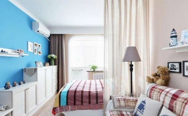 客廳與臥室只用了一扇紗簾來隔開,軟隔斷在保證隱私的前提下,也讓空間具有更好的連通性。粉刷了藍色墻漆的墻面顯得活潑溫雅,一排連續(xù)的儲物柜讓收納有了足夠的空間。